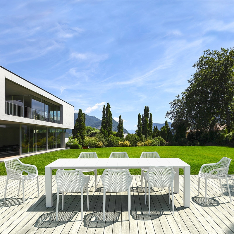 Set vegas τραπέζι 100X260/300 με 8 πολυθρόνες Air XL σε χρώμα white του οίκου Siesta. Κατασκευασμένα από πολυπροπυλένιο για απόλυτη αντοχή. Ένα set με ιδιαίτερο desing και άριστη κομψότητα ιδανικό για επαγγελματική και για οικιακή χρήση. Κατάλληλο για εσωτερικό και εξωτερικό χώρο. Διατίθεται σε χρώματα white, taupe, dark grey και black.